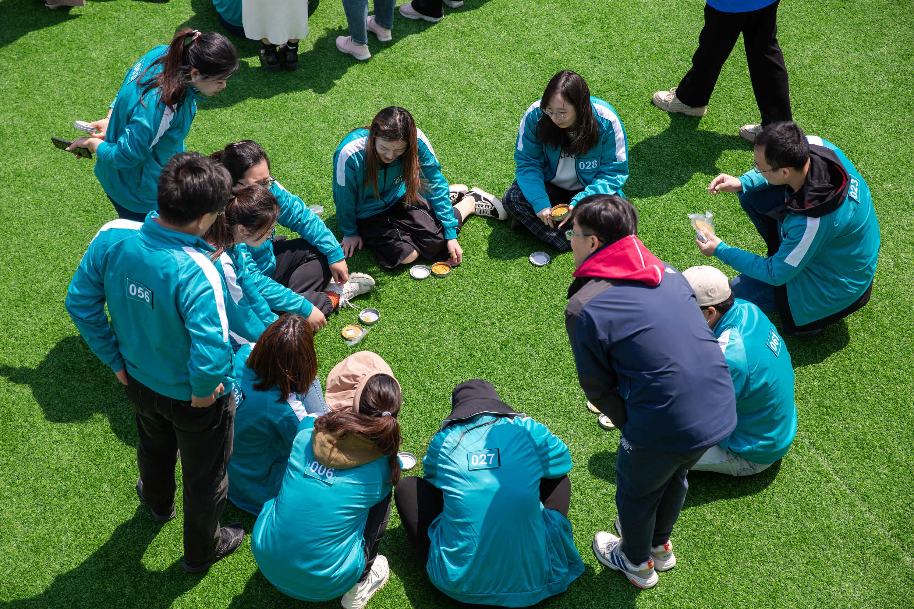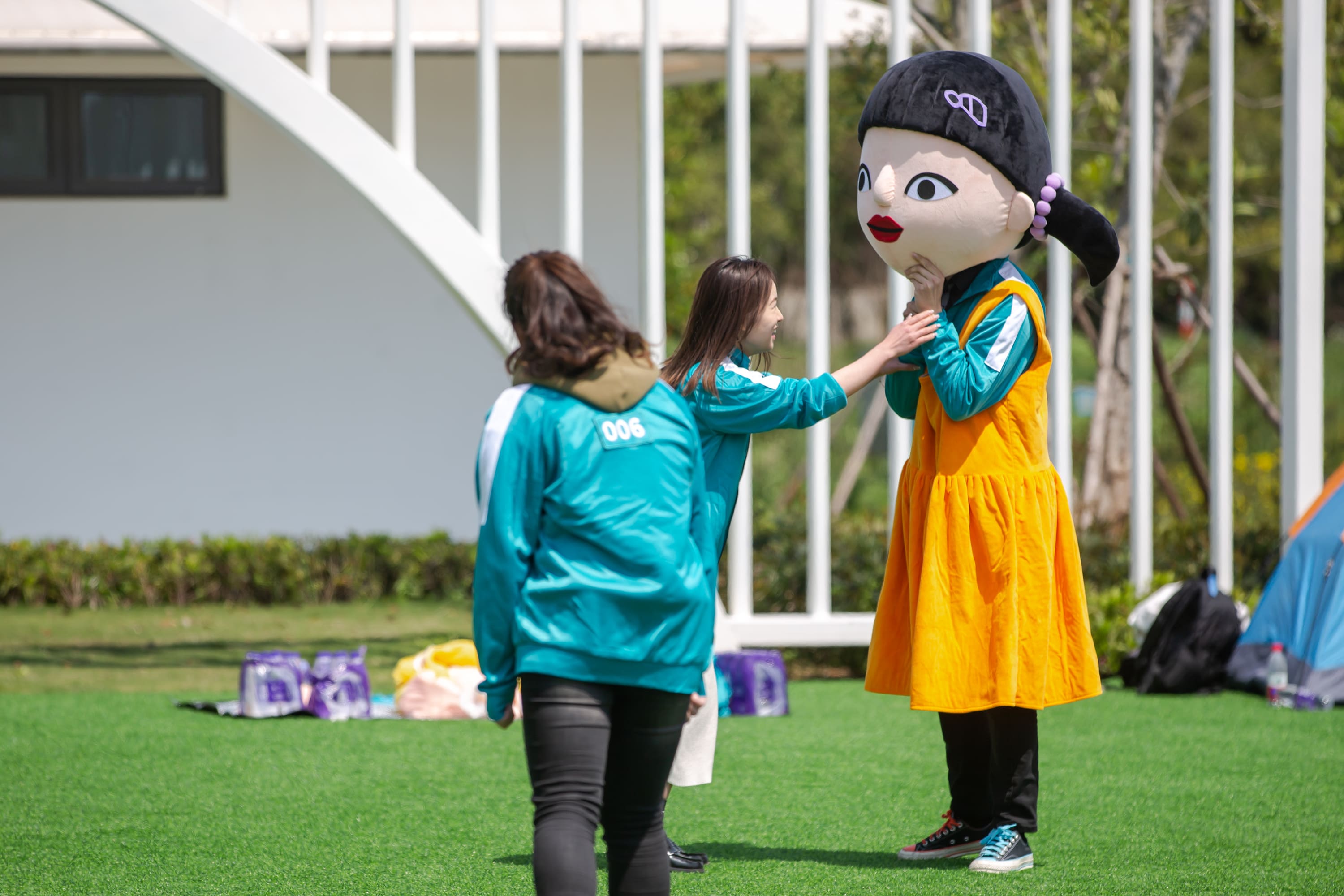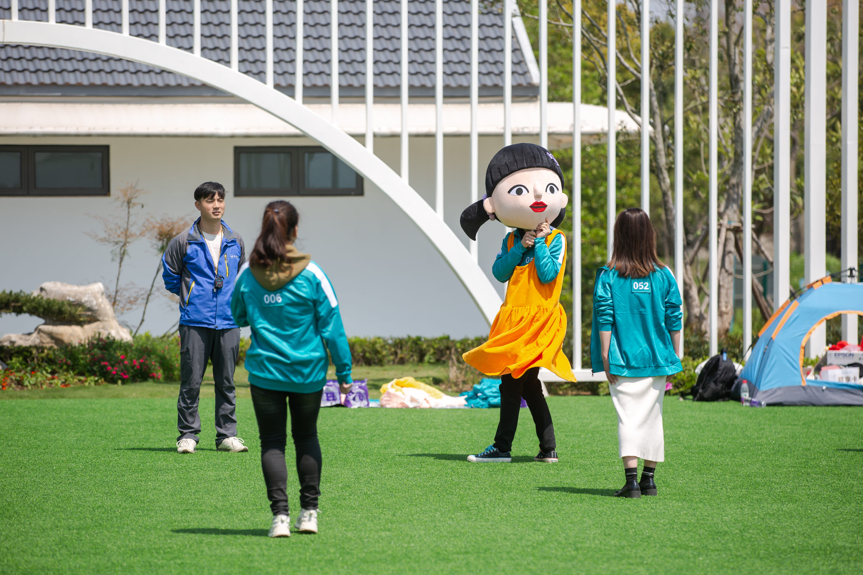 2023年,嘉定支行,在长兴岛郊野公园进行了鱿鱼游戏主题的团建,休闲放松的同时各小组也不失团队竞争的意识。