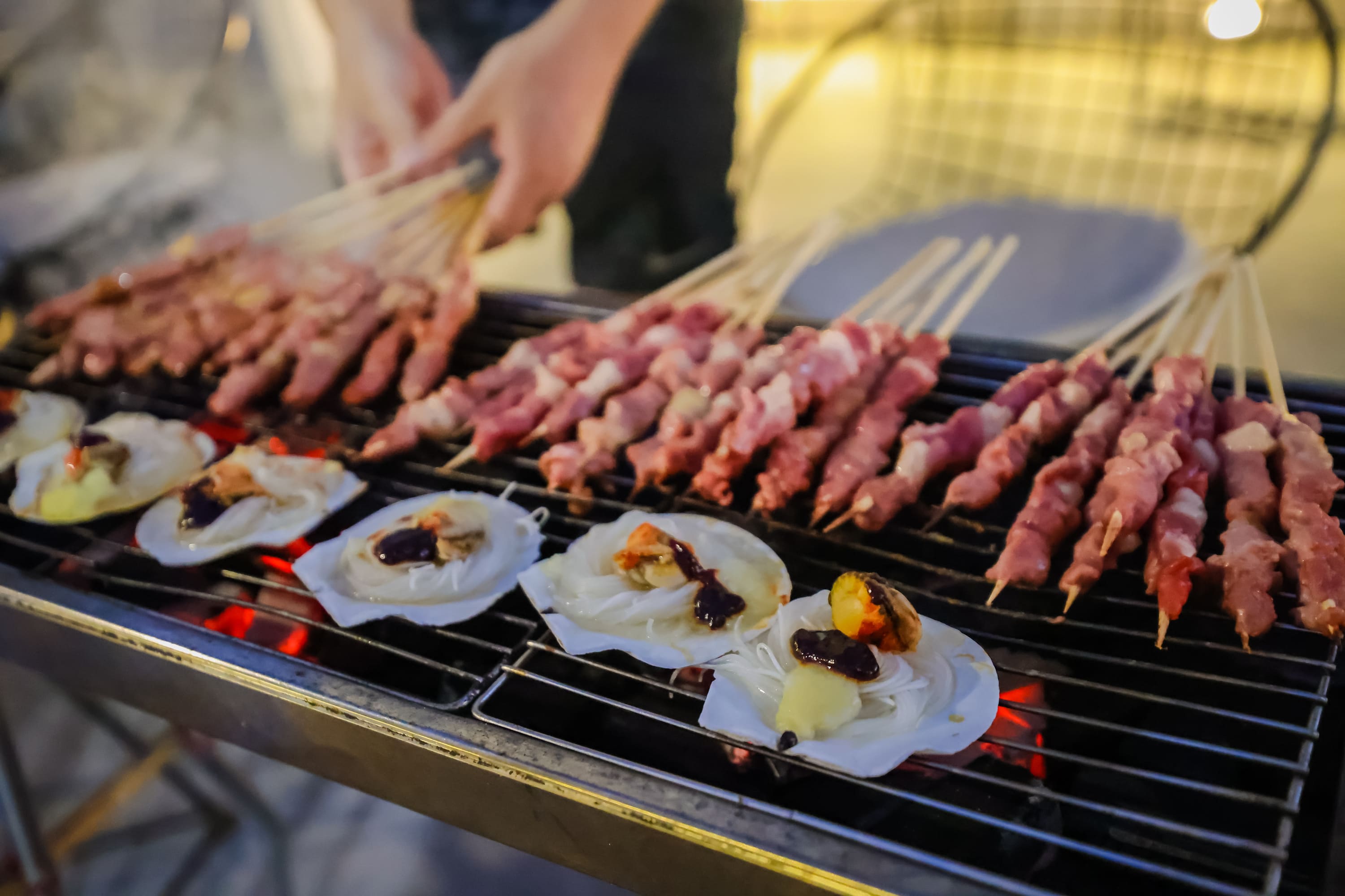 新鲜海鲜排队上烤架,烤鱼金黄酥脆,蒜蓉粉丝蒸扇贝蒜香扑鼻,香辣蟹钳辣中带香。